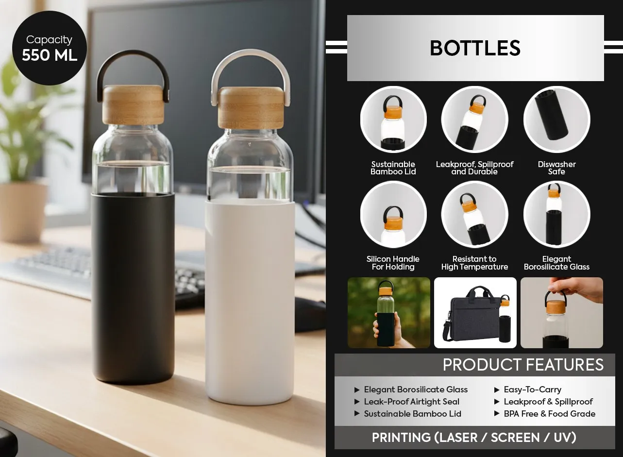 A premium 550 ml borosilicate glass bottle featuring a sustainable bamboo lid, silicone carrying handle, and protective silicone sleeve. Designed for durability, style, and everyday hydration at home, office, gym, and travel.